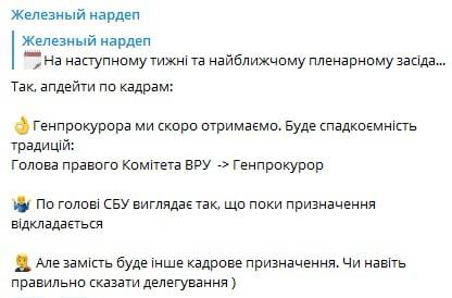 "Генпрокурора мы скоро получим. Будет преемственность традиций: председатель правого комитета ВРУ - генпрокурор", - написал Железняк, имея в виду, что прошлый генпрокурор Ирина Венедиктова также была до назначения главой правового комитета.