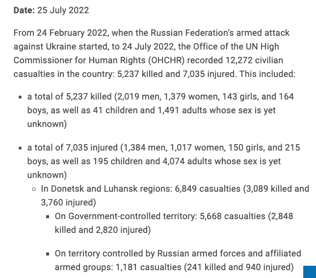 С 24 февраля война в Украине забрала жизни, как минимум, 5237 гражданских, еще 7035 ранены.