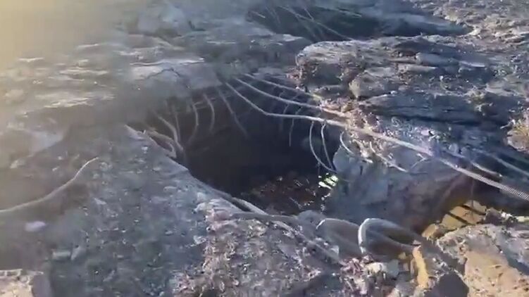 Видны сильные пробоины, и мост в этом месте непроездной. При этом перекрытие не рухнуло. Голос за кадром говорит, что прилеты пришлись примерно в то же место, что и в прошлый раз.