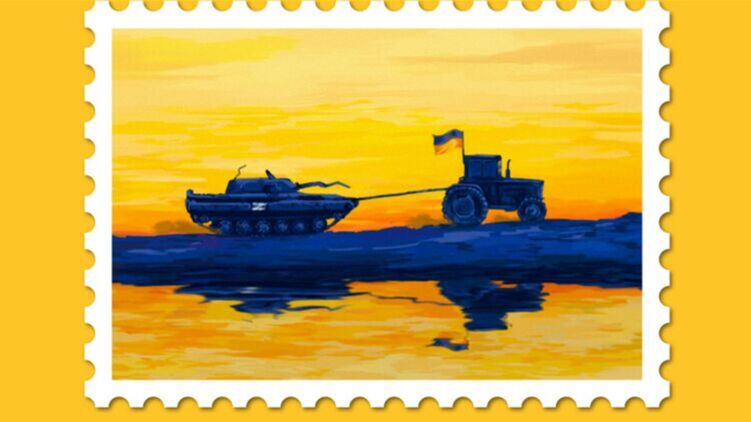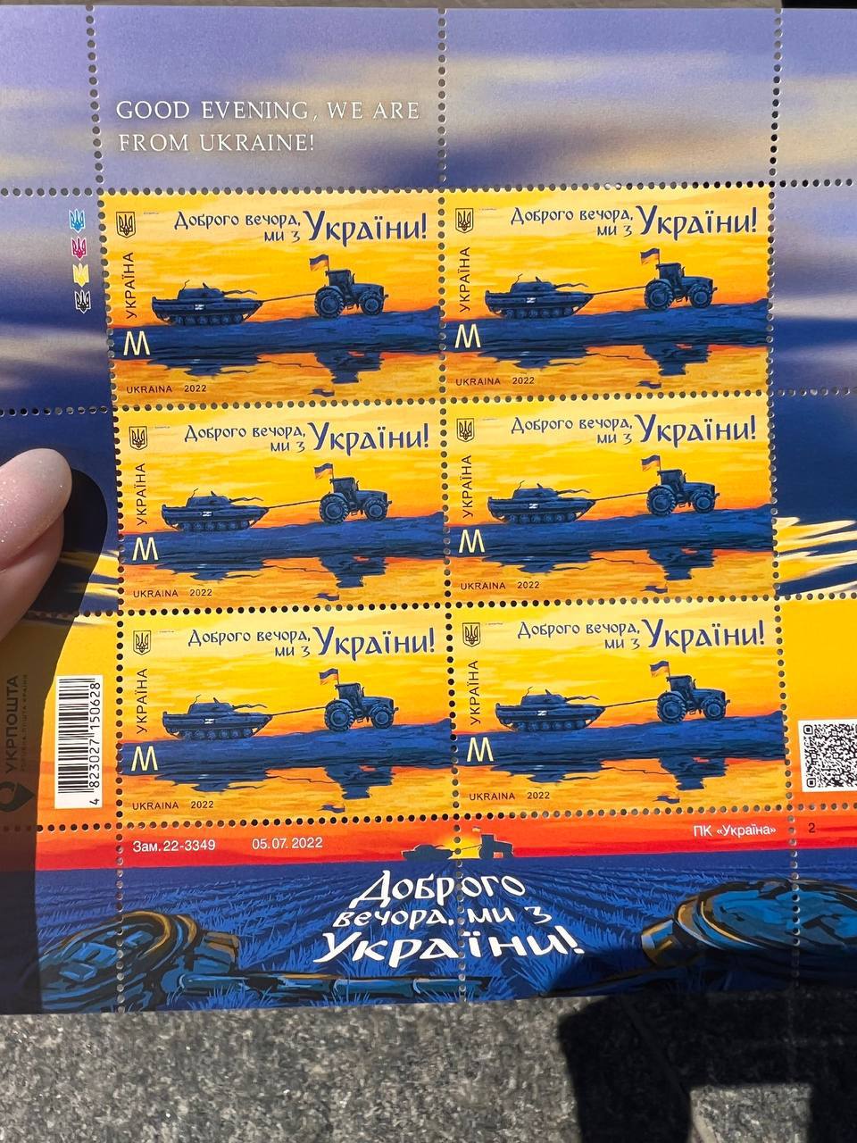 В Украине выпустили новую почтовую марку "Добрый вечер, мы из Украины". Марка посвящена "тракторным войскам" и выпущена тиражом в 5 миллионов экземпляров, из которых 3 млн – с номиналом М (эквивалент 18 грн) для оплаты почтовых отправлений внутри страны и 2 млн – с номиналом W (эквивалент $1,5), предназначенным для оплаты международной почтовой корреспонденции.