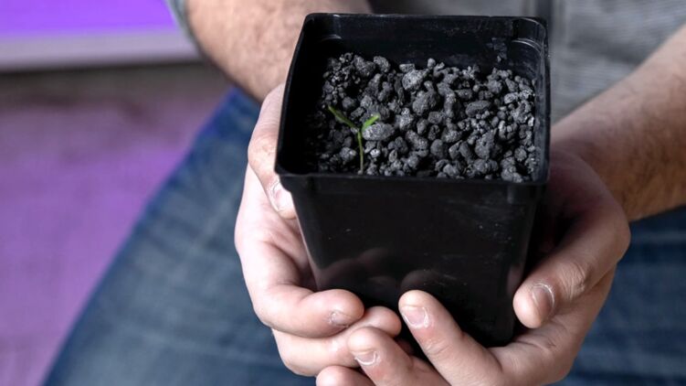 Образец имитатора вещества астероидов с ростком перца. Фото: Mike Hess, UND Today