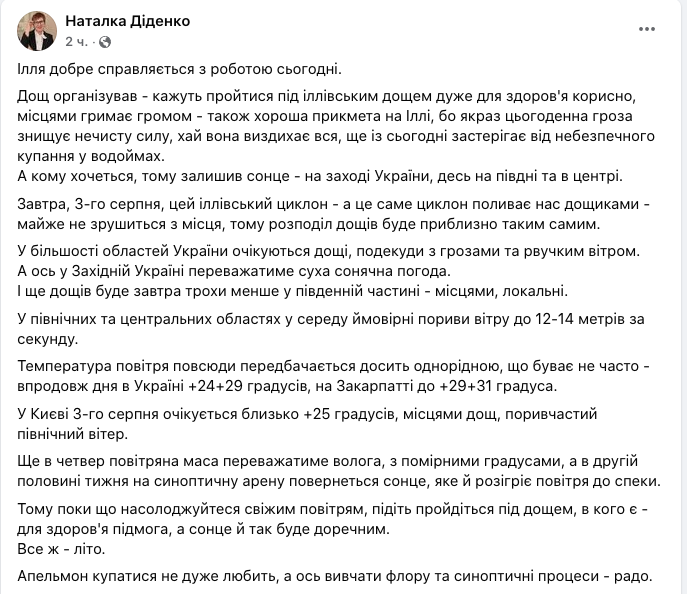 Сегодняшний День Ильи в Украине сопровождается обильными дождями и грозами, что считается хорошей приметой. Завтра также сохранится дождливая погода, поскольку циклон почти не сдвинется с места.