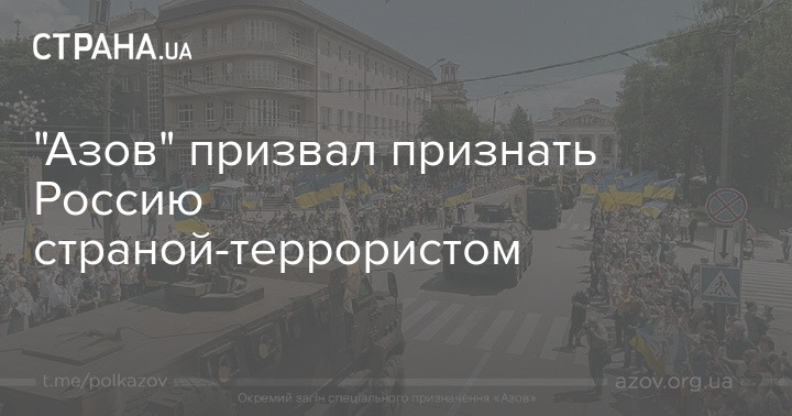 Помимо этого "Азов" призвал Госдеп США и уполномоченные органы других государств признать РФ государством-террористом. "Россия много лет своими ежедневными действиями доказывает этот статус. Ежедневно ее армия и спецслужбы совершают военные преступления. Попустительство этим преступлениям или молчание – это соучастие! Весь мир должен объединиться против государства-террориста! Слава Украине! Победа за нами!", - говорится в сообщении азовцев, которое также переведено на английский язык.