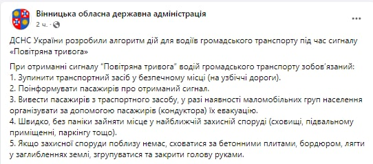 Как сообщают в Винницкой ОГА, "ГСЧС Украины разработала алгоритм действий для водителей общественного транспорта во время сигнала тревоги".