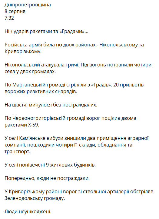 Ночью с 7 на 8 августа россияне нанесли ракетный удар по Червоногригоровской громаде - между Никополем и Марганцем, на правом берегу Днепра.