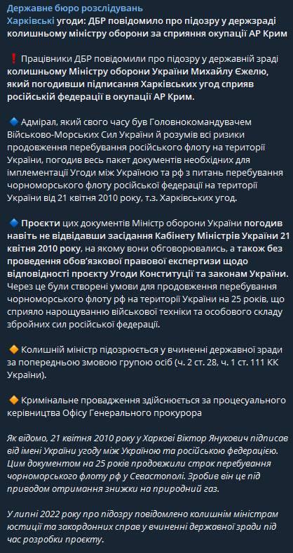 Бывшему министру обороны времен президентства Виктора Януковича Михаилу Ежелю сообщили о подозрении в государственной измене за "Харьковские соглашения", которые в 2010 году продлили пребывание в Севастополе Черноморского флота РФ еще на 25 лет в обмен на скидку на газ.