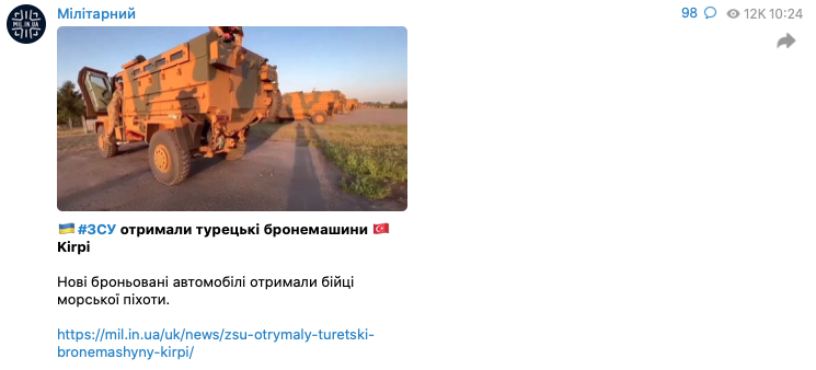 Морская пехота Военно-Морских сил ВСУ получила первые 50 бронемашин Kirpi турецкого производства. Вскоре ожидается еще одна поставка 150 таких машин.