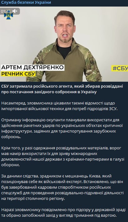 СБУ заявила о задержании "военного эксперта", который сливал россиянам данные о поставках западного оружия
