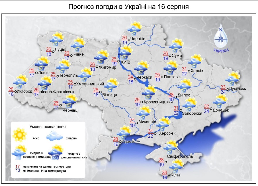 В многих регионах Украины сегодня днем, 16 августа, ожидаются дождь и теплая погода. А на восточную Украину пришла жара с температурами выше 30 градусов.