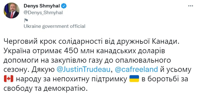 "Очередной шаг солидарности от Канады. Украина получит 450 млн канадских долларов помощи на закупку газа к отопительному сезону", - написал Шмыгаль.