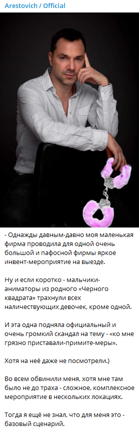 Впрочем, позже Арестович решил отредактировать свой пост, убрав две последние строки и прикрепив забавное фото с розовыми наручниками, которые продаются в секс-шопе.