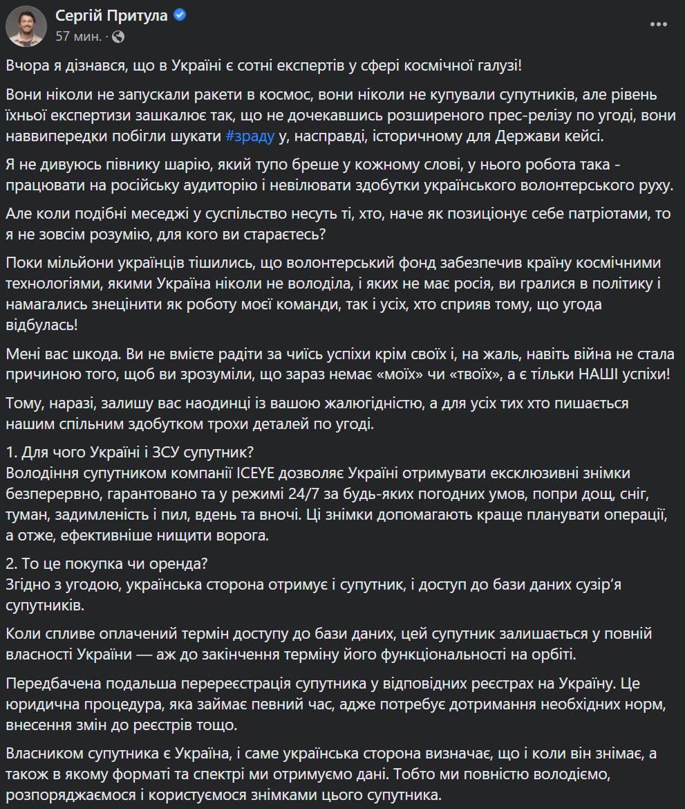Притуле приходится отвечать на многочисленную критику после покупки спутника. Фото: facebook/serhiyprytula