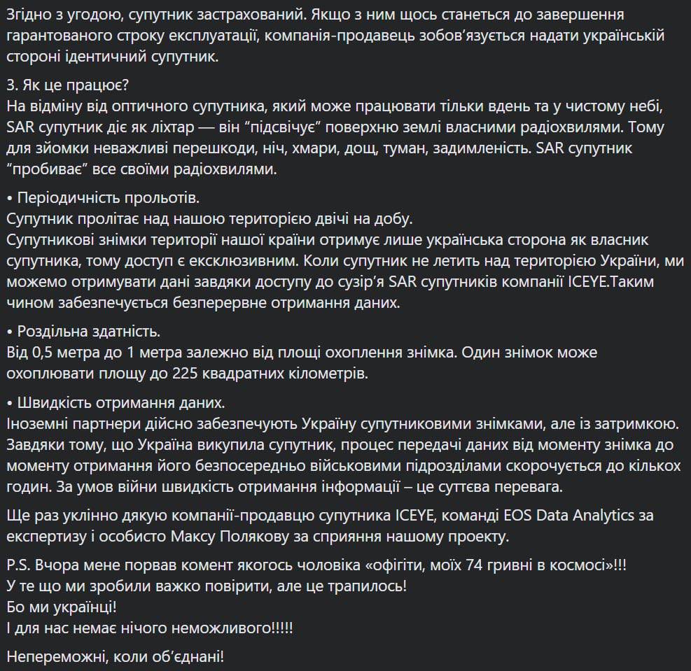 Притула говорит, что владение спутником компании ICEYE позволяет Украине "получать эксклюзивные снимки непрерывно, гарантированно и в режиме 24/7 при любых погодных условиях", а это позволяет лучше планировать операции и эффективно уничтожать врага.