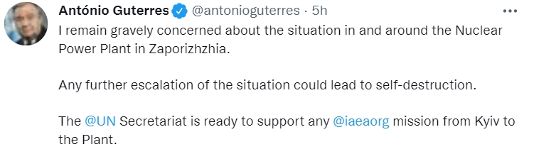 "Секретариат ООН готов поддержать любую миссию из Киева на АЭС", - написал он.