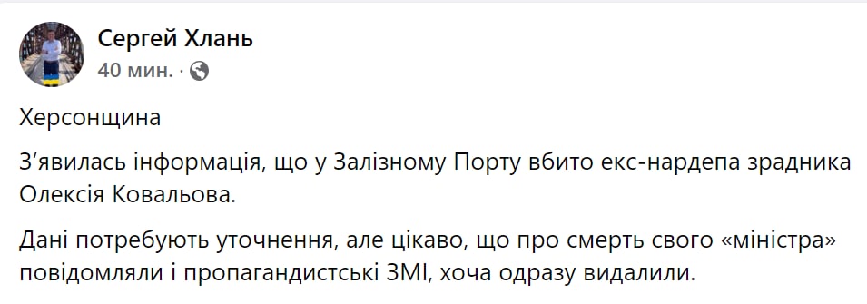 "Появилась информация, что в Железном Порту убит экс-нардеп предателя Алексей Ковалев. Данные нуждаются в уточнении", - сообщил Хлань.