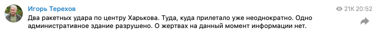 20:56 Мэр Харькова Игорь Терехов подтверждает удары по центру Харькова около административного здания «куда уже прилетало неоднократно».