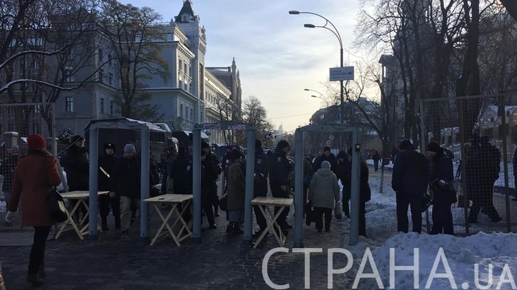 Порядок на акции охраняют около сотни силовиков, которые рассредоточились по улице Институтской. Здесь также стоят еще четыре микроавтобуса с бойцами нацгвардии. Подъезд к НБУ отгорожен сетчатым забором и двумя рамками металлоискателей.