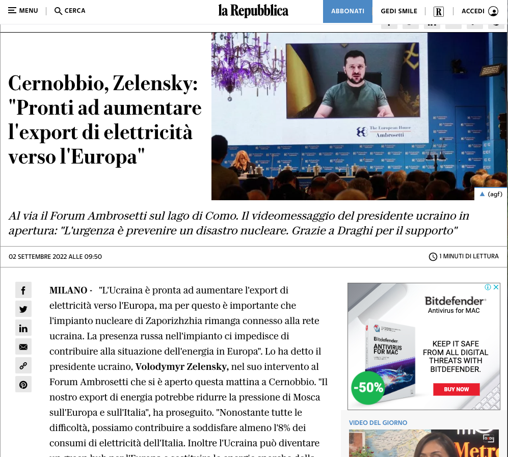 Об этом президент Украины сказал в своем выступлении на форуме Амброзетти в итальянской коммуне Черноббьо, передает газета La Repubblica.