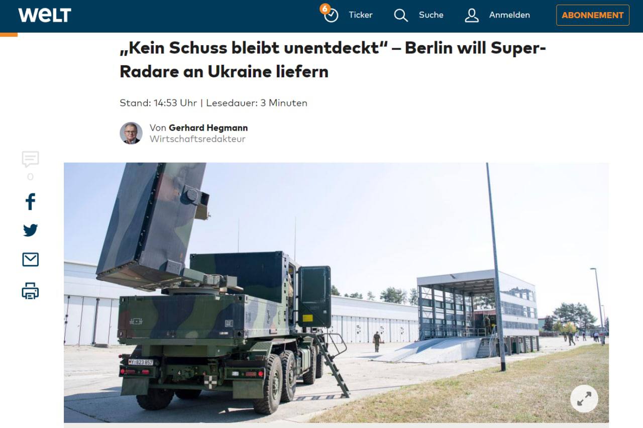 07.50 Германия передала Украине контрбатарейный радар COBRA, обещанный еще летом. А также пять зенитных самоходных установок Gepard, пишет "Немецкая волна".