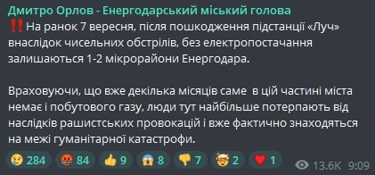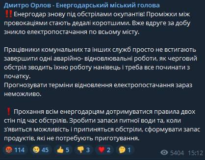 11.00 Энергодар снова без света. Из-за повреждения подстанции "Луч" 1-2 микрорайона города обесточены, сообщил мэр Дмитрий Орлов.