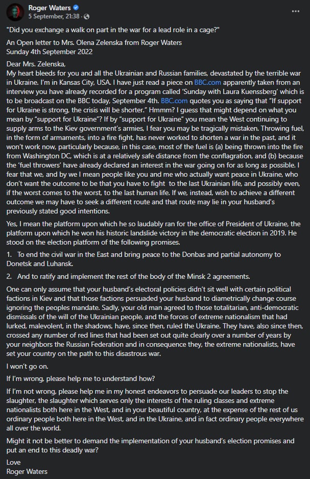 Письмо Уотерса - реакция на интервью Зеленской, где она сказала, что "если поддержка Украины будет сильной, то кризис будет короче".