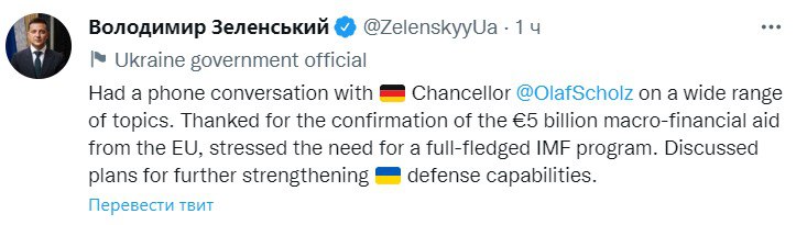 - Сообщил о телефонном разговоре с канцлером Германии, в результате чего согласованы вопросы о финансовой помощи ЕС.