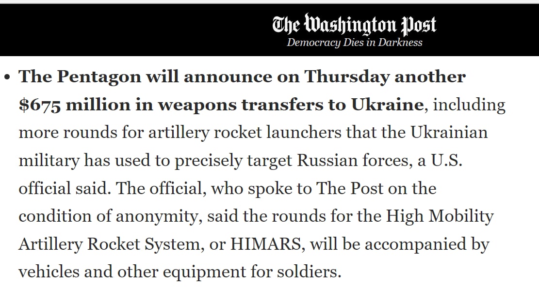 В четверг, 8 сентября, Пентагон объявит о новом пакете военных поставок Украине на 675 миллионов долларов. В него войдут новые ракеты для HIMARS, а также военный транспорт.