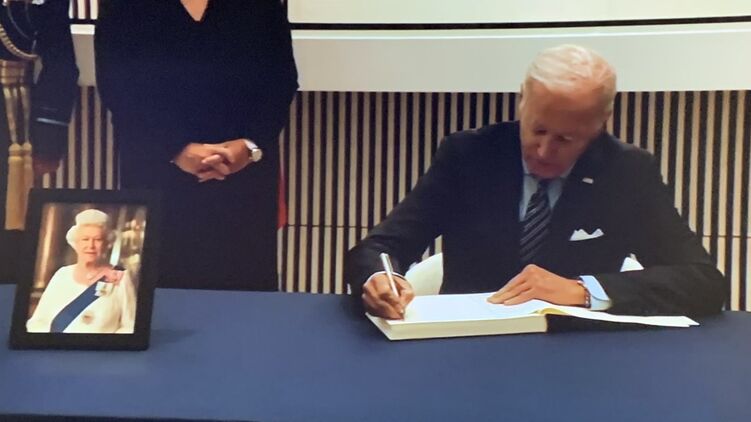 В день смерти монарха Байден посетил посольство Великобритании в Вашингтоне, чтобы оставить запись в книге соболезнований. Президента и первую леди США Джилл Байден встретили посол Великобритании Карен Пирс и ее супруг.