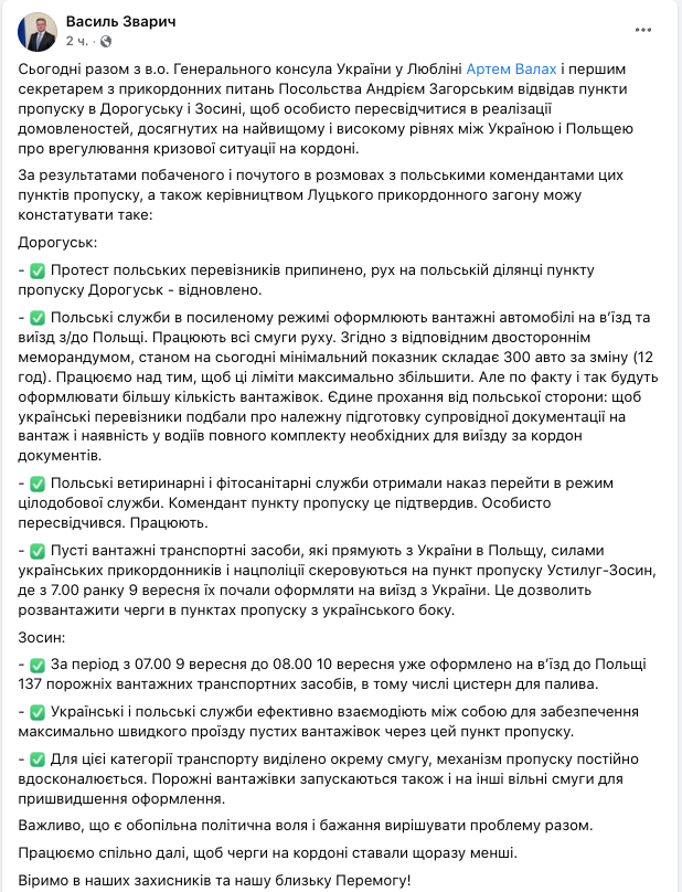 "Комендант пункта пропуска подтвердил это. Лично убедился. Работают", - говорит Зварыч.