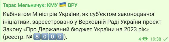 19:46 Кабмин зарегистрировал в Верховной Раде проект госбюджета-2023 под номером 8000.