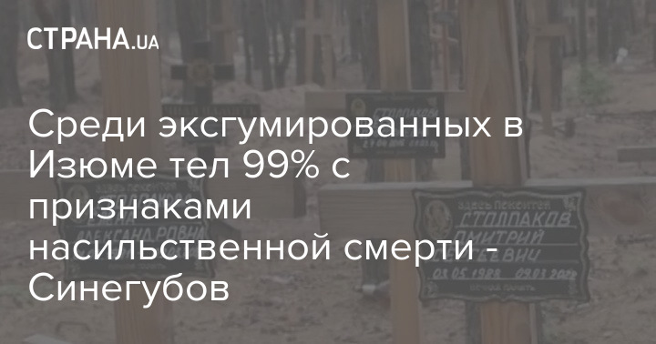 Среди тел, которые были эксгумированы вчера на месте массового захоронения в Изюме, 99% с признаками насильственной смерти. Об этом сообщил глава Харьковской ОВА Олег Синегубов.