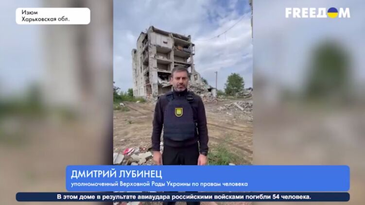 Омбудсмен Дмитрий Лубинец показал разрушенный многоквартирный дом в Изюме, под развалинами которого погибли 54 человека.