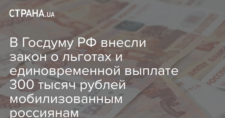 Закон о единовременной выплате в 300 тысяч рублей (чуть более 190 тысяч гривен) для граждан России, которых призовут во время мобилизации, внесен в Госдуму РФ. Его авторы - депутаты от "Единой России" и КПРФ.