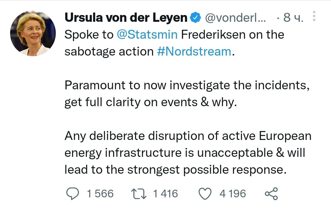 Глава Еврокомиссии Урсула фон дер Ляйен назвала случившееся "саботажем" и "преднамеренным нарушением европейской энергетической инфраструктуры".