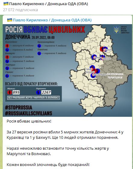 07.55 За минувшие сутки 27 сентября от действий армии РФ в Донецкой области погибли 5 мирных жителей: 4 в Кураховке и 1 в Бахмуте. Еще 10 человек получили ранения.