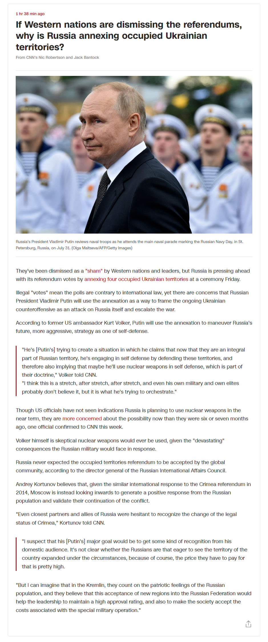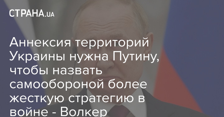 Бывший спецпредставитель США по Украине Курт Волкер считает, что президент РФ Владимир Путин намерен использовать аннексию Донбасса и юга Украины для применения в будущем более жёсткой стратегии России в войне (вплоть до угрозы использования ядерного оружия), которая будет представлена как самооборона.