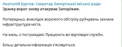 Запорожье рано утром обстреляли ракетами РФ. Есть пострадавшие