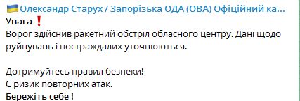 Утром 3 октября войска РФ снова обстреляли ракетами Запорожье. Об этом сообщил глава Запорожской ОВА Александр Старух.