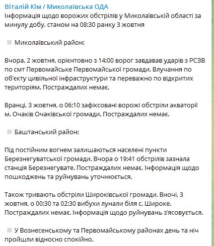 В Николаевском районе вчера ориентировочно в 14:00 враг наносил удары из РСЗО по пгт Первомайское. Попадание по объекту гражданской инфраструктуры и преимущественно по открытым территориям. Пострадавших нет.