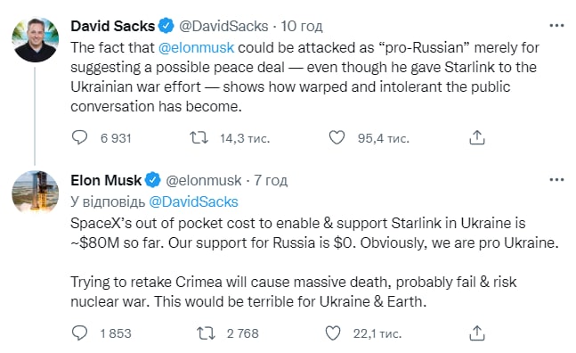 После этого советник главы ОП Подоляк ответил Маску что "есть мирный план получше" - Украина освобождает территории, в том числе и Крым, Россия подвергается демилитаризации и денуклиаризации, а военных преступников - ждет трибунал.