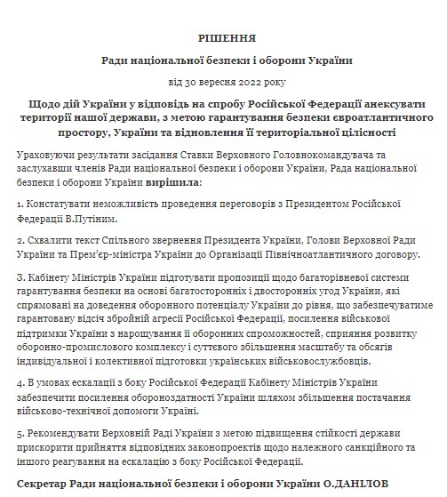 Президент Владимир Зеленский своим указом ввел в действие решение Совета национальной безопасности и обороны от 30 сентября о действиях Украины в ответ на попытку России аннексировать территории Украины, которым констатируется невозможность проведения переговоров с президентом России Владимиром Путиным.