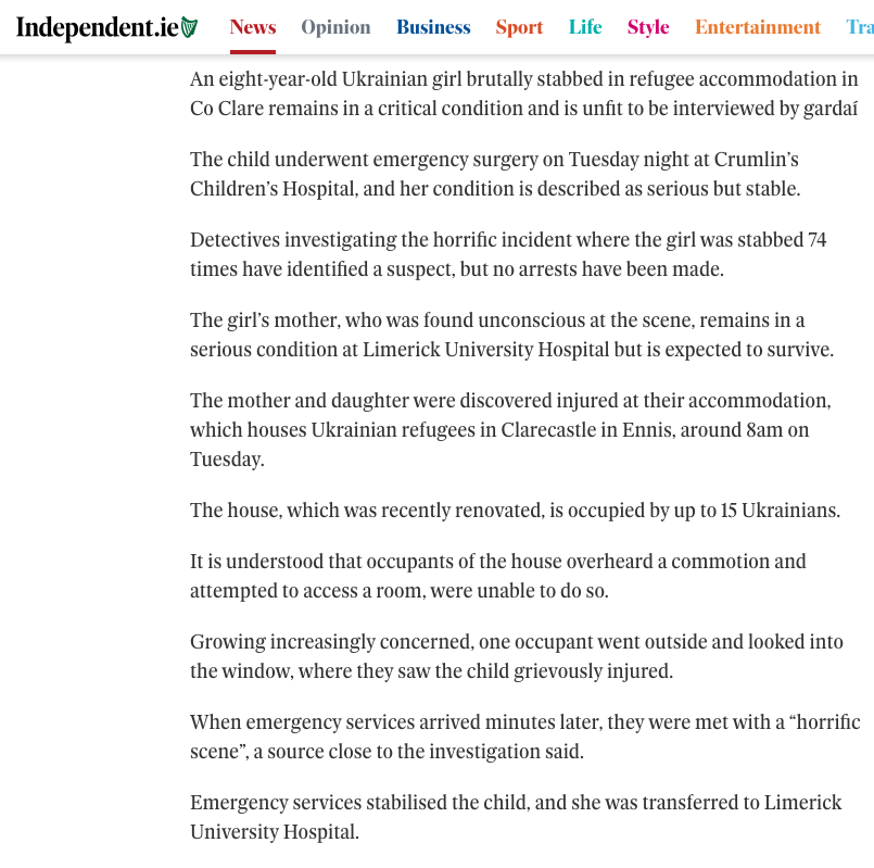 В ирландском городе Клеркасл совершено жуткое нападение на украинок. Восьмилетней девочке и ее маме нанесли тяжелые ножевые ранения прямо в доме, где проживает до 15 украинских беженцев. Ребенку нанесли более 70 ранений.