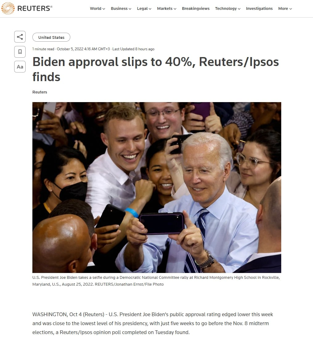 Рейтинг общественного одобрения президента США Джо Байдена за пять недель до промежуточных выборов снизился и приблизился к самому низкому уровню за время его президентства.