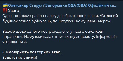 Появились фото и видео последствий удара по Запорожью. Ракета упала во дворе многоэтажки