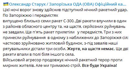 Ранее в горсовете Запорожья сообщали, что от ночного удара в домах вылетели окна и двери, но погибших и других разрушений нет.