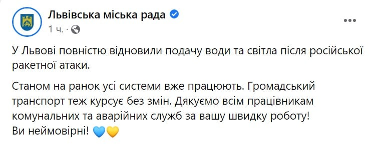 "Во Львове полностью восстановили подачу воды и света после российской ракетной атаки. По состоянию на утро все системы уже работают. Общественный транспорт работает без изменений", - говорится в сообщении.