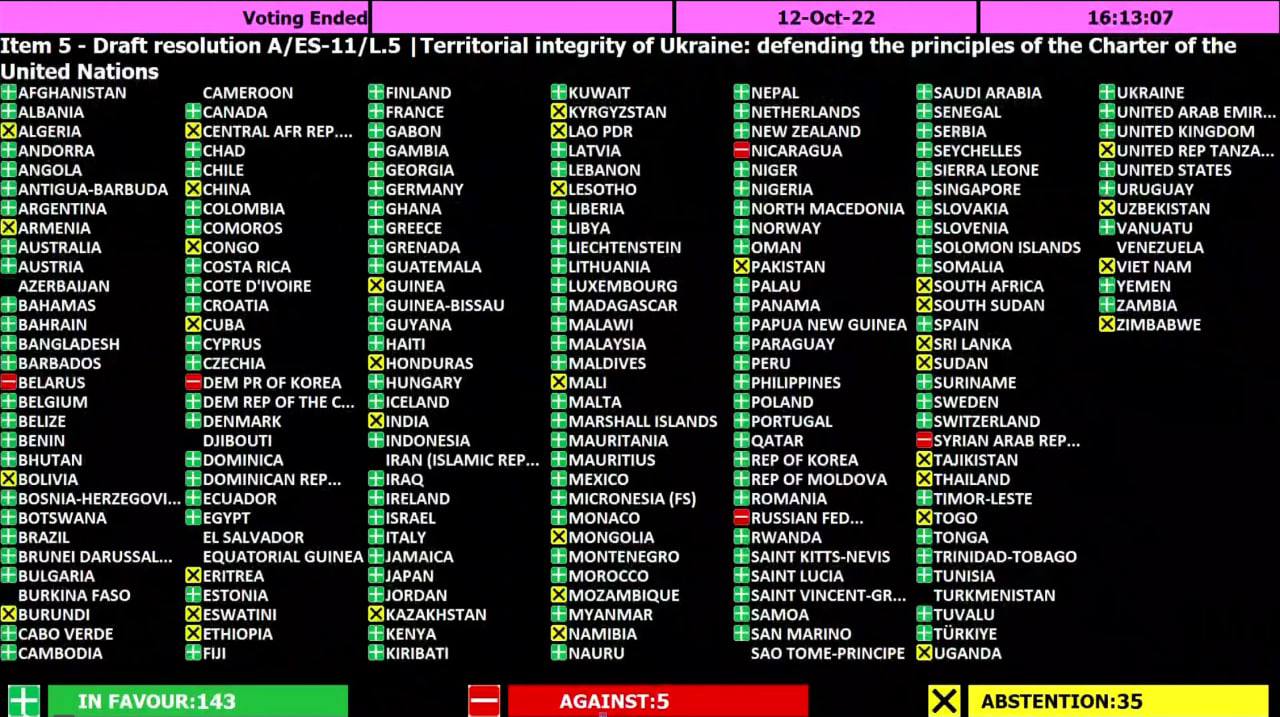 Вчера ООН приняла резолюцию с критикой действий России. В документе говорится, что государства осудили организацию "референдумов" и аннексию украинских территорий. И признают лишь границы Украины по состоянию на 1991 год.
