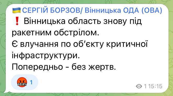 07:45 Несмотря на три сбитые ракеты, одна из них ударила по объекту энергетики в Днепропетровской области. Об этом пишет губернатор Валентин Резниченко.