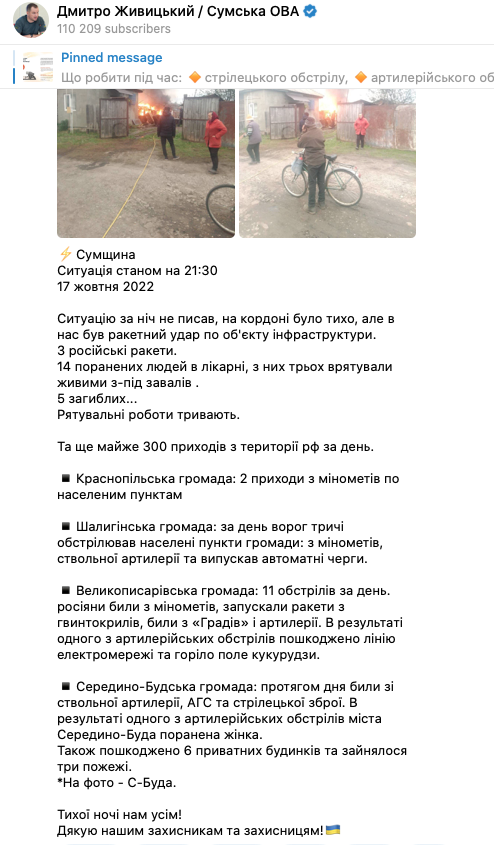 В Сумской области за минувшие сутки от российских обстрелов погибли пять человек, еще 14 человек ранены и находятся в больнице. Спасательная операция продолжается.