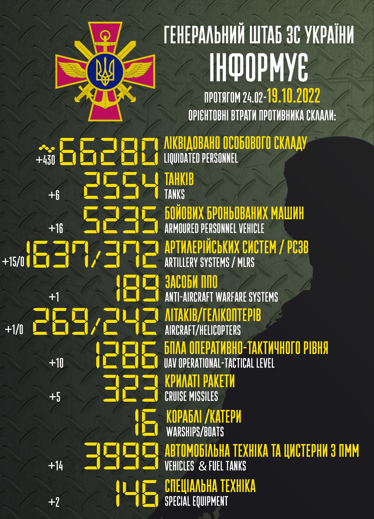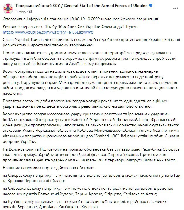 В среду, 19 октября, в Украине идет уже 238-й день войны с РФ.
